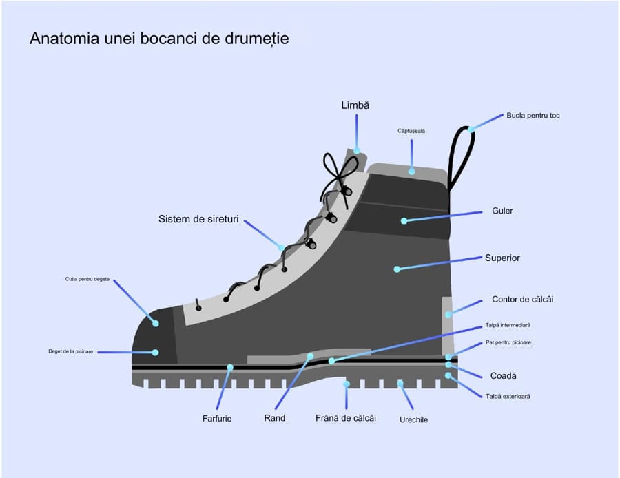 Această diagramă indică diferitele părți ale unei bocanci de drumeție, inclusiv limbă, căptușeală, buclă pentru călcâi, guler, partea superioară, contor pentru călcâi, talpă interioară, tijă, talpă exterioară, urechi, frână pentru călcâi, rand, plăcuță, vârful degetului, căsuța degetului, si sistem de siret.